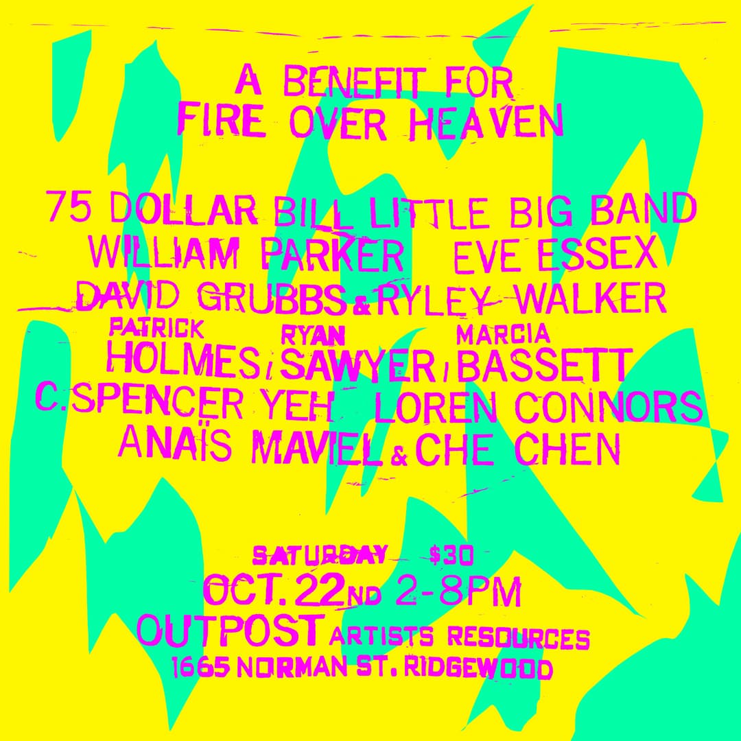 "An epic, 6-hour benefit concert for the Fire Over Heaven music series. In this time of multi-dimensional uncertainty and funding woes, our already meager grants have evaporated and we turn to our community for support. This day-long concert will feature graciously donated sets by The 75 Dollar Bill Little Big Band, Eve Essex, Loren Connors, David Grubbs & Ryley Walker, C.Spencer Yeh, Patrick Holmes & Ryan Sawyer and more artists TBA. Tickets are $30 and all proceeds will go to support the continued work of this concert series."