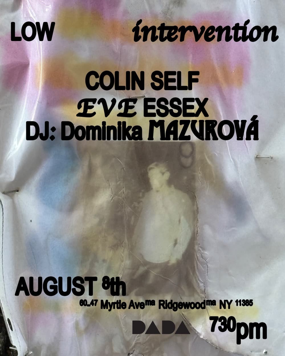 EventEve Essex, Colin Self, DJ Dominika MazurováFri, Aug 8, 2025Dada: 6047 Myrtle Avenue, Ridgewood, NYFeatured MediaDescriptionPart of UCC Harlo's Low Intervention series.Related Media