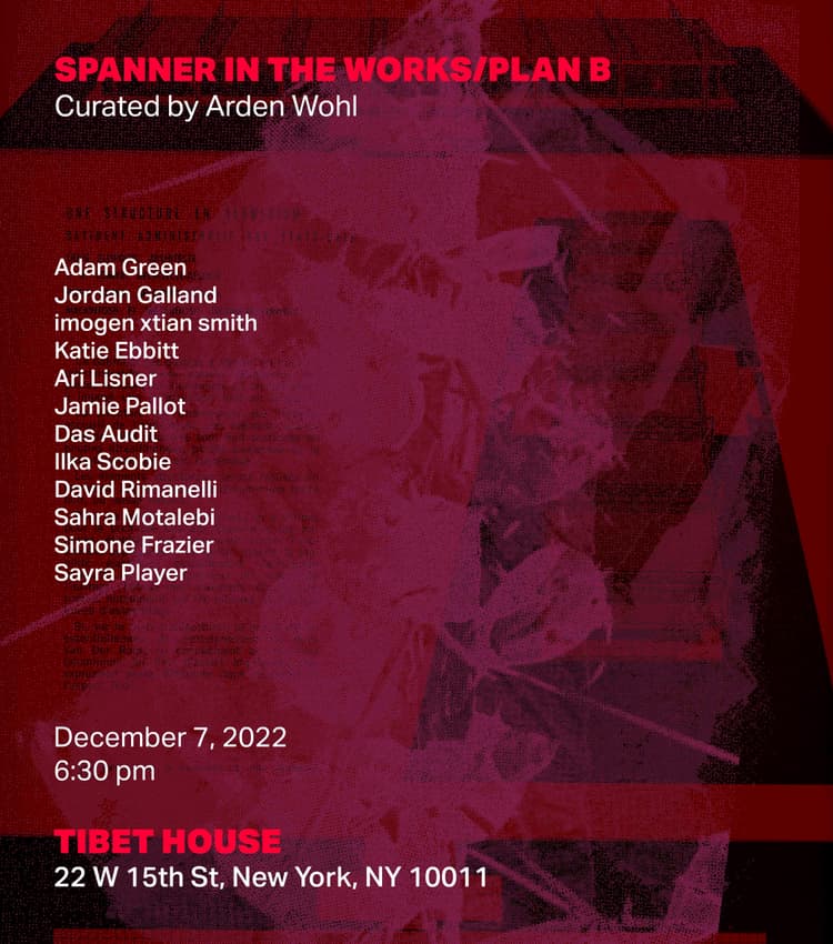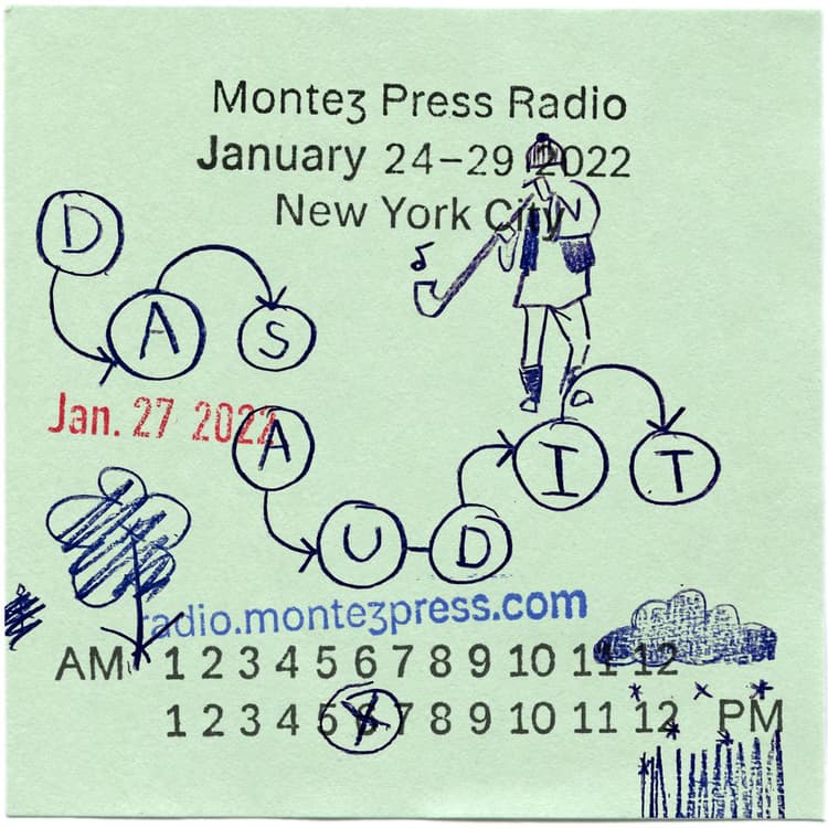 Das Audit is a musical ensemble that has performed regularly in New York City since 2014. Founding members Eve Essex (voice/woodwinds/electronics) and Craig Kalpakjian (electric guitar) were joined in 2022 by Dan Fox (bass/electronics/clarinet). Das Audit’s sound alternates between structured songwriting and free-form improvisation, drawing on elements of jazz, minimalism, post-punk, and prog rock. Their material stems from scores and prompts, with text, graphic, or traditional notation serving as the basis for collective interpretation and expansion. As a quartet with Sean Keenan (bass) and John Anderson (percussion) they have released two albums, Das Audit (2016) and Pioneer Works (live, 2016). They have performed with various collaborators including Kevin Kenkel, Max Gordon, Gelatin, Malcolm Mooney, Stefan Tcherepnin and Philippa Shao. Select New York appearances include KAJE, Tibet House, Baby's All Right, Fire Over Heaven/Outpost Artist Resources, Greene Naftali, KAJE, MoMA PS1 Printshop, The National Arts Club, Pioneer Works, Union Pool, and a commission for SculptureCenter's In Practice program.